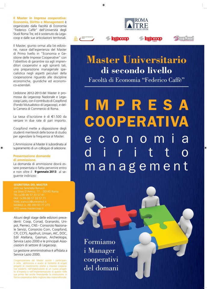 Master in Impresa Cooperativa. Economia, diritto, management: master universitario di secondo livello organizzato dalla Facoltà di Economia “Federico Caffè” dell’Università degli Studi Roma Tre. Il master, giunto ormai alla sua 16 edizione, si pone l’obbiettivo di formare imprenditori cooperativi ed aspiranti tali con una preparazione manageriale specialistica negli aspetti peculiari della cooperazione riguardo alle discipline economiche, giuridiche ed economico-aziendali.