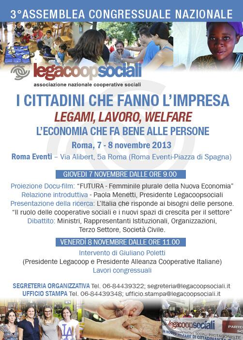 “I cittadini che fanno l’impresa: legami, lavoro, welfare. L’economia che fa bene alle persone”. E’ il titolo della due giorni che si terrà a Roma il 7-8 novembre 2013 per la III Assemblea Congressuale Nazionale di Legacoopsociali. I partecipanti potranno confrontarsi con ministri, rappresentanti istituzionali, organizzazioni di terzo settore, docenti universitari e società civile.